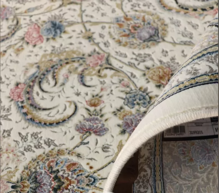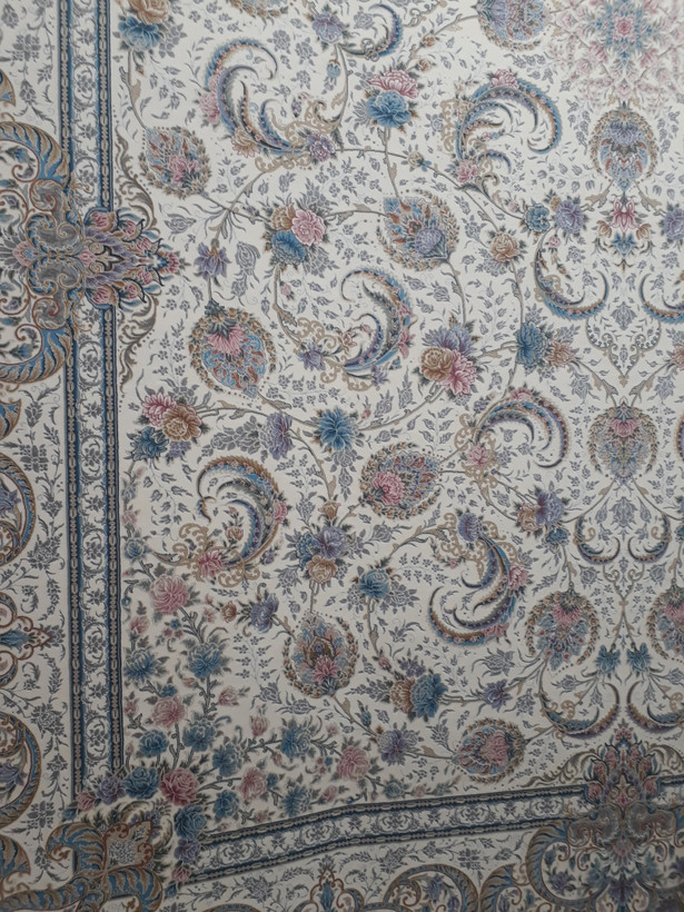 ترنج فرش طراحی منظم و جذاب دارد. ختایی های چیده شده درون ترنج در کنار گل های ظریف و زیبا ، طراحی اصیل به وجود آورده اند. گلدان های زیبا با گل های طبیعی و زیبا ،در لچک های فرش بر زیبایی آن افزوده اند. استفاده از گل های پنهان در زمینه الماسی ، با ظرافت خاصی صورت گرفته است .