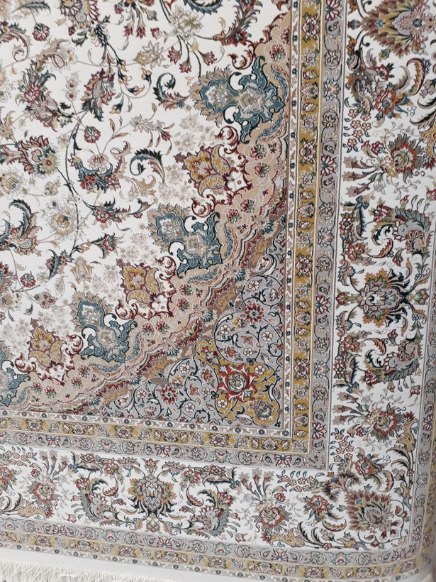 پسزمینه این فرش خاص و منحصربهفرد به رنگ کرم است. رنگ کرم در گروه رنگهای خنثی قرار میگیرد و ترکیبش با رنگهای گرم و سرد، هارمونی بسیار زیبایی را تشکیل میدهد. رنگ کرم به دلیل پتانسیل بالای ترکیبش با رنگهای دیگر، معمولاً در دکوراسیون داخلی رنگ امنی به شمار میرود و نظر طراحان را به خود جلب میکند. این رنگ اصولاً با رنگهایی نظیر قهوهای و طلایی، ترکیب زیبایی را میسازد.